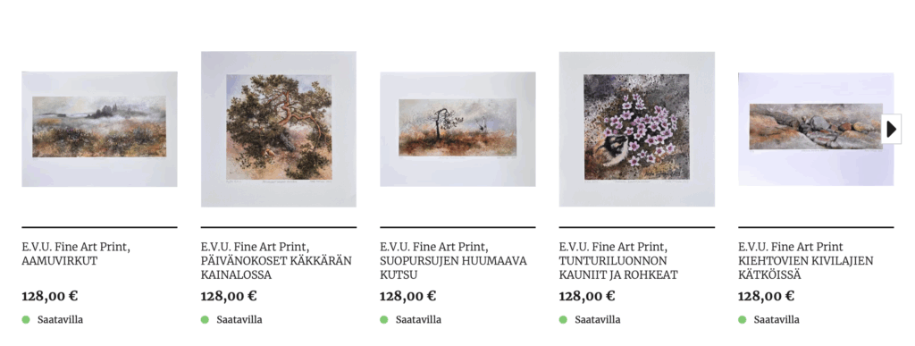 Myynnissä olevat teokset, grafiikat, Fine Art Printit, julisteet, kortit ynnä muut uutuudet löytyvät nykyään kaikki kätevästi monipuolisesta verkkokaupasta